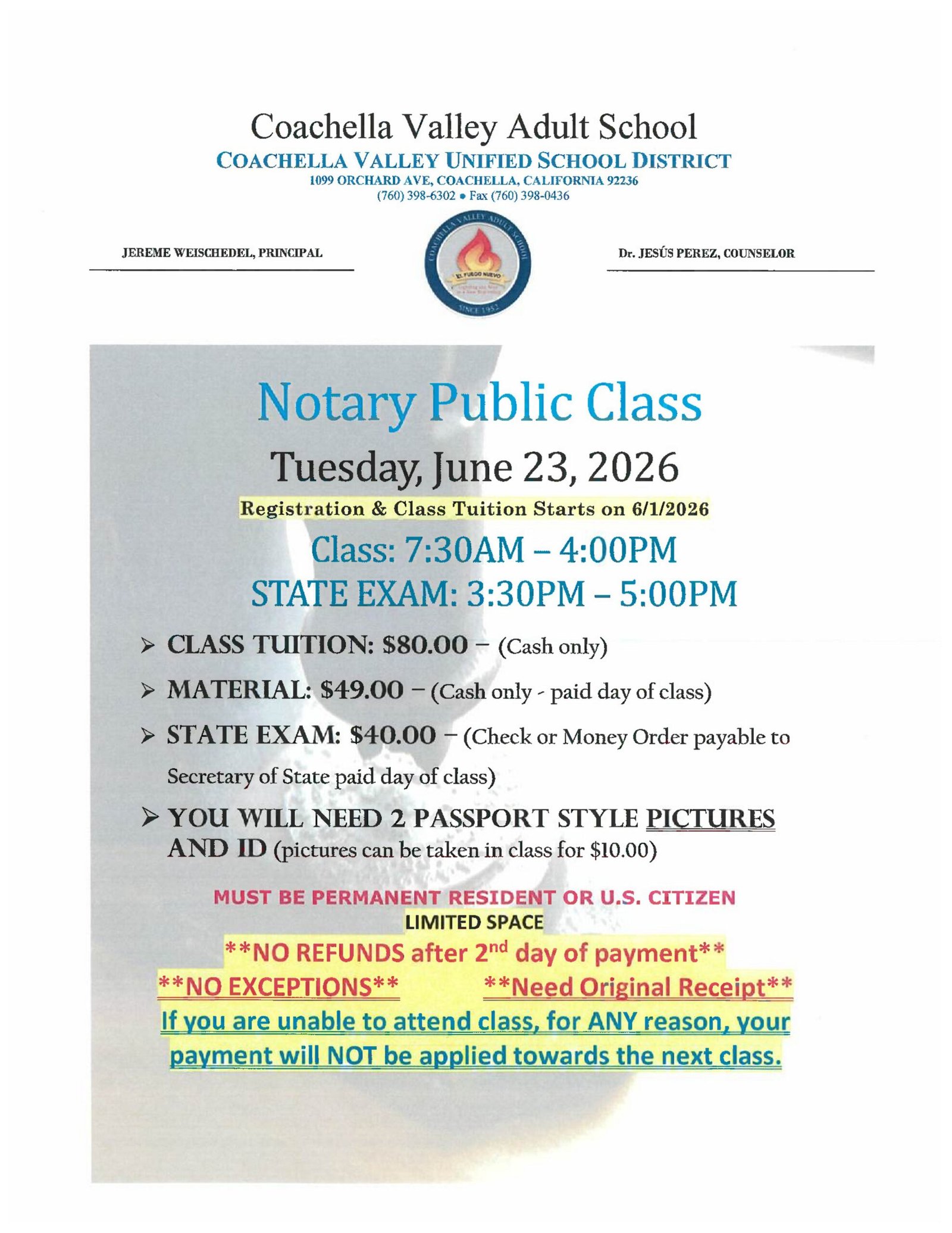 > STATE EXAM: $40.00 — (Check or Money Order payable to Secretary of State paid day of class)